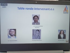 La conférence s’inscrivait parmi les évènements soutenus par le programme femmes , paix et sécurité – action humanitaire (WPS-HA), elle était modérée par Dr Ernestine NGO MELHA avec la participation du G100 ( plaidoyer mondial, Me Patricia Elias) , AAEEH ( Dr Roddrigue Magloire MELHA MELHA ) et de nos partenaires de RD Congo (Mr MUMBERE MANDELA), de la Côte d’Ivoire (Mme KONAN).